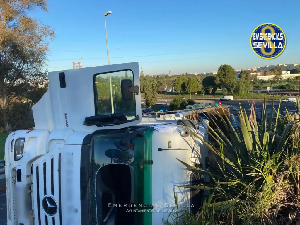 Los bomberos han tenido que intervenir en un siniestro vial con salida de vía y vuelco de un camión que transportaba arena junto al Centro Comercial Lagoh. El accidente ha ocurrido sobre las 9:05 horas de la mañana del viernes en la incorporación a A4 sentido Cádiz desde Avenida Palmas Altas.