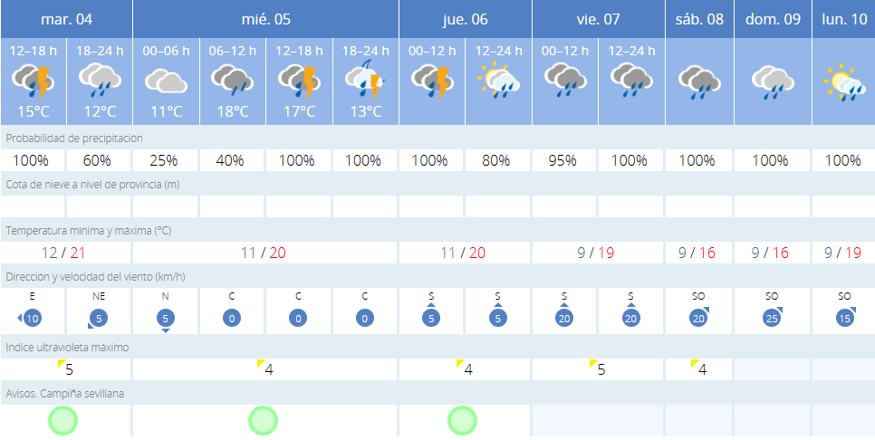 La lluvia no dará tregua esta semana en Sevilla. Según la predicción de la Agencia Estatal de Meteorología (Aemet), este miércoles 5 de marzo, la capital hispalense amanecerá con cielos nublados y un 40% de probabilidad de precipitaciones entre las 06:00 y las 12:00 horas.