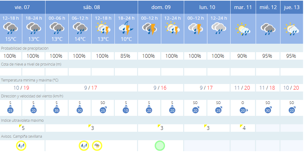 Este panorama meteorológico augura un fin de semana pasado por agua y un inicio de semana con lluvias persistentes en la capital hispalense. Se recomienda a los sevillanos extremar las precauciones ante posibles tormentas y estar atentos a las actualizaciones meteorológicas.