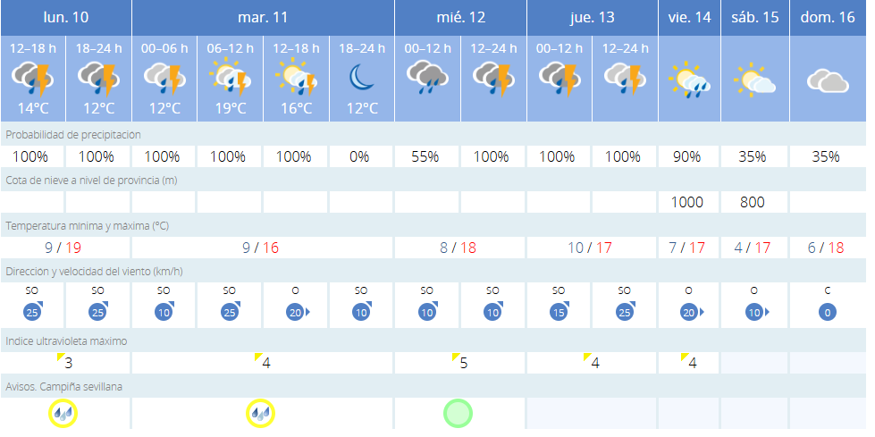 El jueves 13 se mantendrá el tiempo lluvioso con tormentas a lo largo de la jornada y una probabilidad de precipitación del 100 %. Las temperaturas bajarán ligeramente, situándose entre los 10 y 17 grados, mientras que el viento soplará desde el oeste con rachas de hasta 25 km/h.