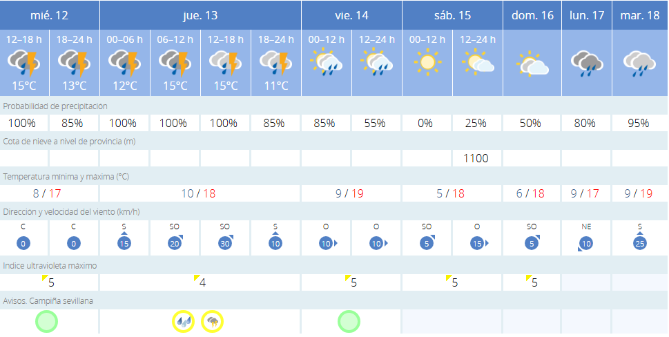 Según la previsión de la Agencia Estatal de Meteorología (Aemet), el jueves 13 de marzo la lluvia será protagonista durante todo el día, con tormentas y un 100 % de probabilidad de precipitaciones. Un aviso amarillo por el temporal estará activo durante la jornada. Las temperaturas oscilarán entre los 10 y los 18 grados, mientras que el viento soplará desde el suroeste con rachas de hasta 20 km/h.