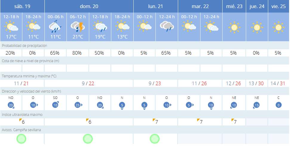 Sevilla vivirá una semana marcada por un arranque inestable con lluvia y tormentas para el final de la Semana Santa, seguido de una notable mejoría que dejará cielos despejados y temperaturas en ascenso hacia el fin de semana.