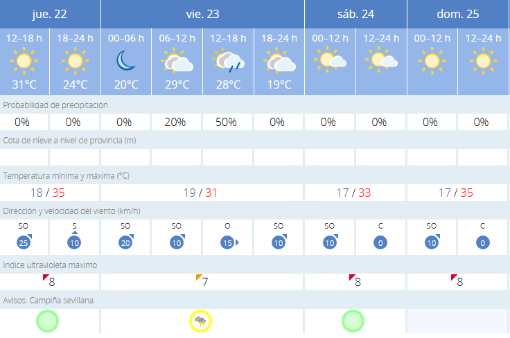 Sevilla afronta los próximos días con temperaturas en aumento y cielos mayoritariamente despejados, aunque el viernes se presenta como la jornada más inestable con un aviso amarillo por tormentas activo. Según la Agencia Estatal de Meteorología (Aemet), este jueves 22 de mayo se esperan temperaturas que alcanzarán los 35 °C de máxima y 18 °C de mínima, con cielos completamente despejados durante todo el día. El viento soplará del sur a 10 km/h y el índice ultravioleta máximo será 8, por lo que se recomienda extremar la protección solar.