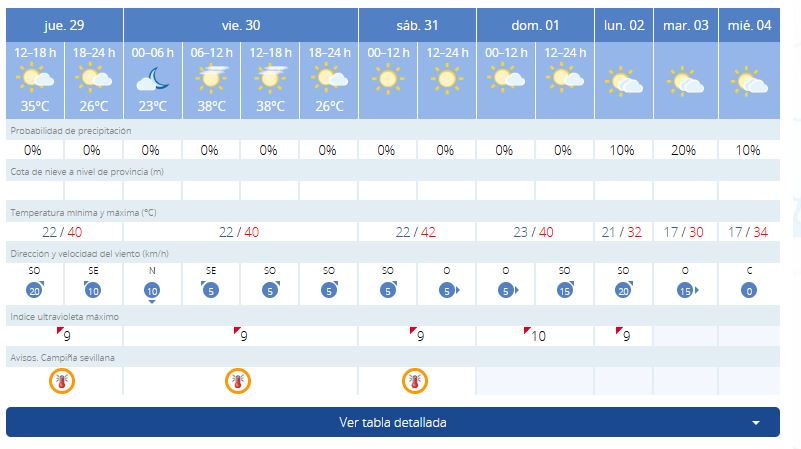 Hasta el domingo, cuando la alerta naranja, en principio, habrá desaparecido, la AEMET prevé que las temperaturas en Sevilla capital llegarán a los 40 grados este jueves y el viernes. El sábado apunta a ser el día más caluroso, con 42 de máxima. Las noches, desde este jueves hasta el sábado, alcanzarán los 22 grados, siendo 23 grados la cifra para el domingo.