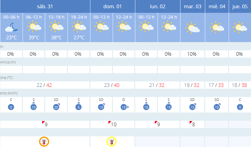 El domingo 1 de junio, aunque las temperaturas descenderán ligeramente, se mantendrán en niveles muy elevados, con una máxima prevista de 40 grados y mínimas en torno a los 23 ºC. Será otro día plenamente veraniego, sin rastro de precipitaciones y con cielos despejados o poco nubosos.