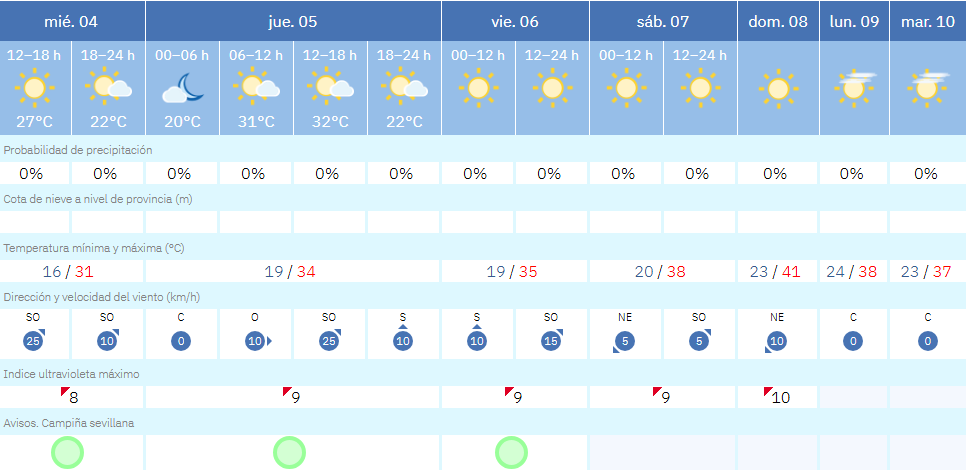 Sevilla vivirá una intensa subida de temperaturas en los próximos días, con una ola de calor que dejará máximas que superarán los 40 grados el domingo día 8 de junio, según la Agencia Estatal de Meteorología (AEMET). La ausencia total de precipitaciones, los cielos despejados y un alto índice de radiación ultravioleta marcarán el tiempo durante toda la semana.