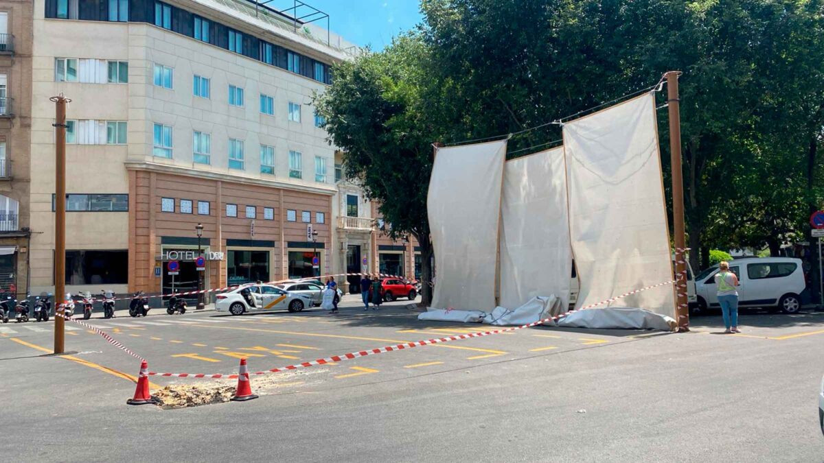 El Ayuntamiento de Sevilla ha procedido a retirar en las últimas horas todos los elementos de los toldos de la plaza del Duque, que protegía del sol a la parada de taxis, tras la caída de uno de los cuatro postes el pasado 23 de mayo, que arrastró todo el mecanismo. En este sentido, tanto los soportes como las lonas han sido trasladados a los almacenes municipales para su revisión.