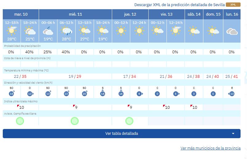 A partir del jueves 12 de junio, la probabilidad de lluvia es del 0%, y las temperaturas irán in crescendo hasta llegar a las cotas a las que Sevilla lleva acostumbrada las últimas semanas. Desde este jueves 12 hasta el domingo 15 de junio, los grados máximos se prevén de la siguiente manera, en orden: 34, 36, 38, 40. Durante dichos días se estiman también algo de nubes, si bien el calor se prevé protagonista.