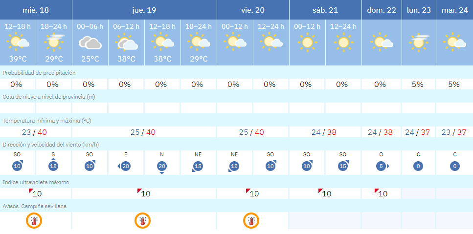 Desde el miércoles 18 y durante al menos cuatro días consecutivos, los termómetros alcanzarán o superarán los 40 grados, con cielos completamente despejados y probabilidad de precipitación del 0 %. La jornada más cálida se prevé para este mismo miércoles, con una máxima de 40 °C y viento del sur y suroeste con rachas de hasta 15 km/h.