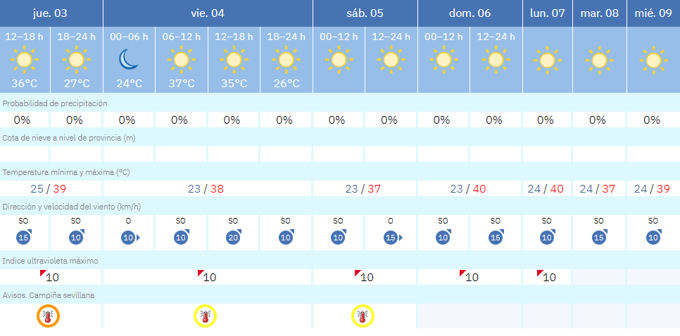 Con esta previsión, el fin de semana en Sevilla será más propicio para buscar sombra, piscinas o lugares climatizados que para actividades al aire libre. El verano sevillano muestra su cara más dura, y el calor seguirá apretando al menos hasta mediados de la próxima semana.