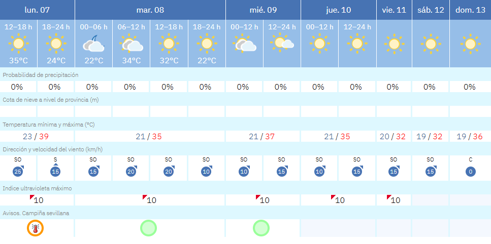 La ola de calor da una tregua esta semana en la Campiña sevillana. Según la Agencia Estatal de Meteorología (Aemet), tras alcanzar máximas de hasta 39 °C este lunes 7 de julio, las temperaturas sufrirán una bajada progresiva en Sevilla hasta situarse en los 30 °C el sábado, lo que supone una bajada de casi diez grados en apenas cinco días.