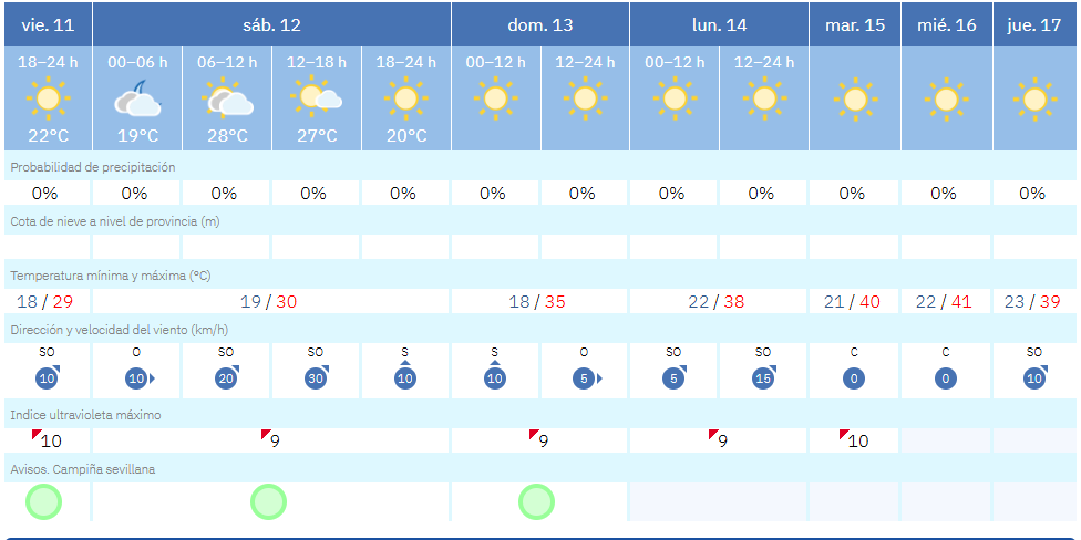 Este viernes 11 de julio, los termómetros alcanzarán los 29 grados de máxima, con cielos despejados y sin probabilidad de precipitaciones. El sábado 12, la temperatura subirá ligeramente hasta los 30 °C, y el domingo el calor se intensificará hasta los 35 grados, preludio de lo que se avecina.