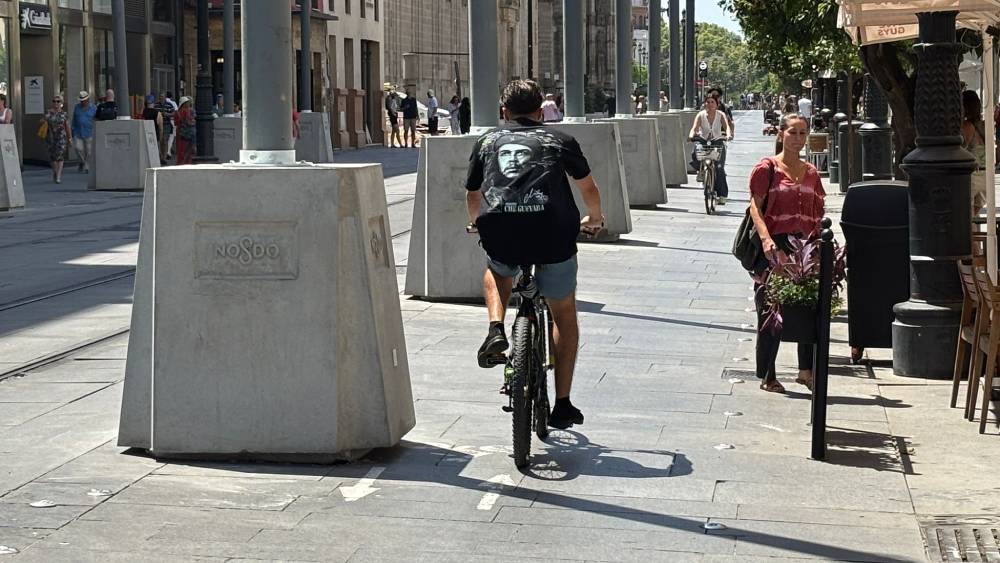 Diez bloques de hormigón invaden el acerado de la avenida de la Constitución, donde además, en uno de sus lados, ha provocado que el carril bici se haya reducido a la mitad en el tramo que va desde el edificio La Adriática hasta poco antes de la esquina con la calle García de Vinuesa. El Ayuntamiento de Sevilla ha instalado estas bases de cemento con cierto retraso, motivado por la celebración de la Cumbre de la ONU en la ciudad. La finalización de estos trabajados estaban previstos para antes de acabar el pasado mes de junio.