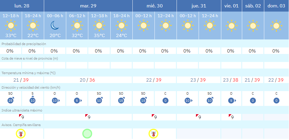 Sevilla afronta una semana marcada por el calor extremo, la ausencia total de precipitaciones y temperaturas que se mantendrán cercanas a 40 grados hasta el domingo. Según la previsión meteorológica de la Aemet, el episodio de altas temperaturas se prolongará durante al menos siete días, con cielos despejados de forma ininterrumpida.