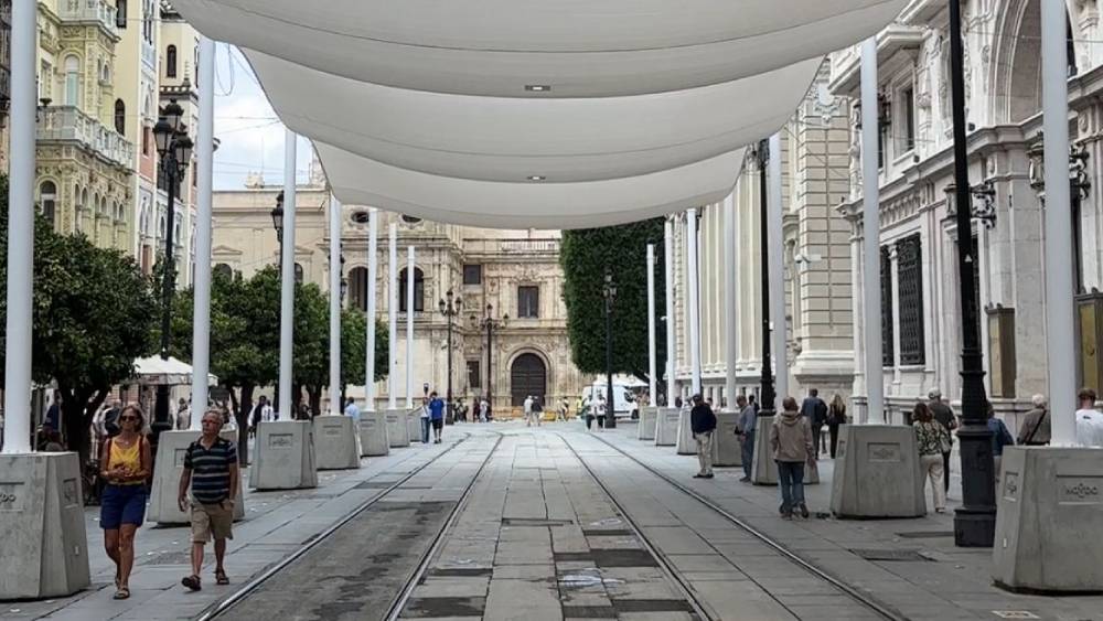El Ayuntamiento de Sevilla desconoce la fecha para la retirada de los toldos de la Avenida de la Constitución. La tardía instalación de las lonas -a un mes de que termine el verano-, unida al incidente del pasado domingo, cuando uno de los toldos se descolgó como consecuencia del fuerte viento y las intensas lluvias, han puesto en cuestión la previsión del Consistorio en un elemento que afecta tanto a la estética como al día a día de vecinos y visitantes, ya que no ha conseguido dar sombras a los viandantes. Sobre este episodio, el alcalde José Luis Sanz explicó que «el propio sistema de seguridad» hace que se descuelguen «cuando los vientos superan más de 70 km/h».