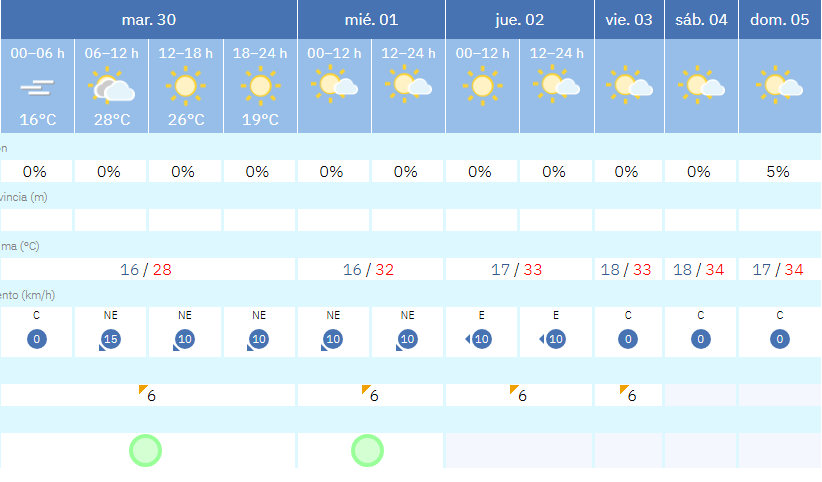 Los vientos soplarán flojos de componente este y nordeste durante la semana, sin fenómenos meteorológicos adversos destacados. El índice ultravioleta se situará en niveles altos (6), por lo que la Aemet recomienda precaución en las horas centrales del día.