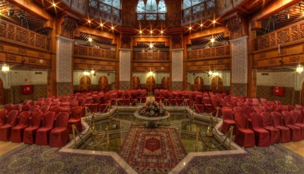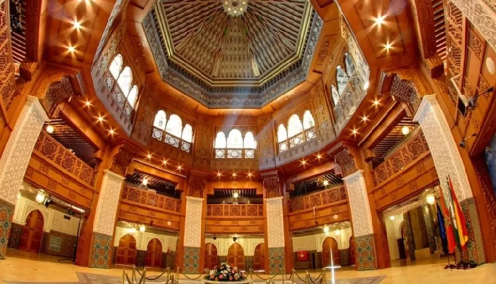 Uno de sus secretos más sorprendentes es su cúpula móvil. Puede desplazarse para dejar al descubierto el patio central, permitiendo que la luz natural inunde el espacio. Esta innovación arquitectónica se combina con artesanías tradicionales: yeserías, cerámicas, mosaicos y maderas talladas por maestros artesanos marroquíes.