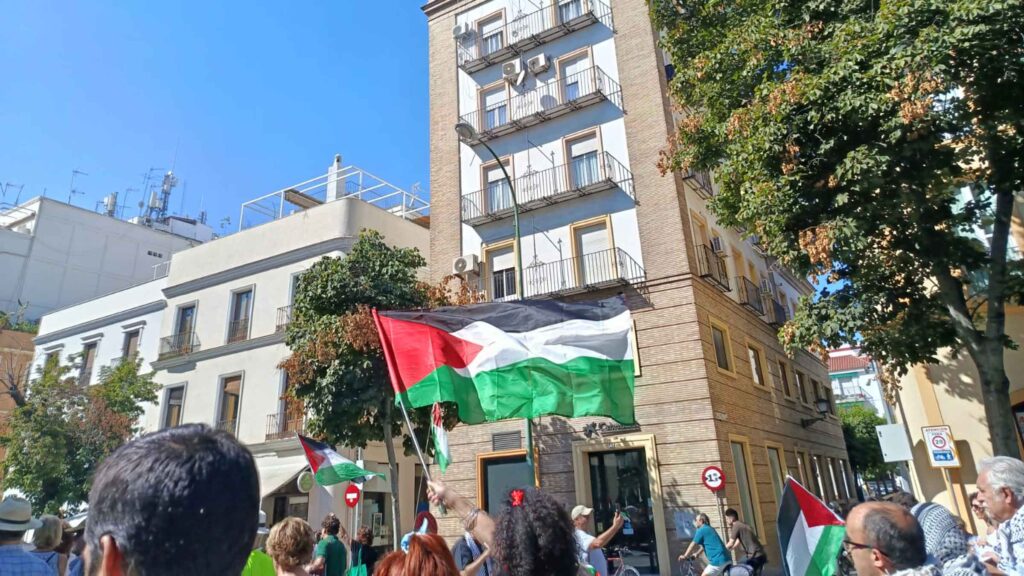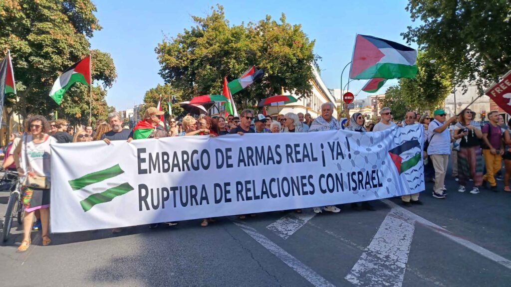 Las calles de Sevilla acogen este sábado 4 de octubre de 2025 una multitudinaria manifestación en apoyo al pueblo palestino, convocada por la Plataforma de Solidaridad con Palestina y otros colectivos sociales y ecologistas. Bajo el lema «Embargo de armas y ruptura de relaciones con Israel», la marcha ha partido de la calle José Laguillo y recorre el centro de la ciudad hasta el Prado de San Sebastián.