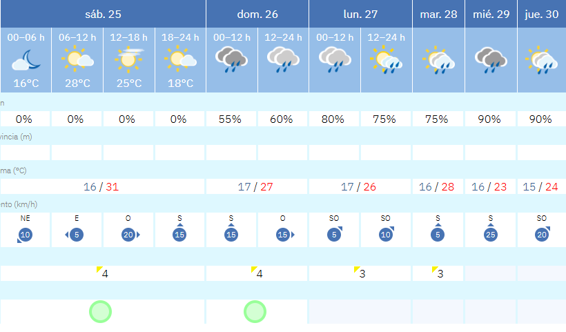El sábado 25 será estable, con cielos despejados durante toda la jornada y sin riesgo de precipitación. Las temperaturas oscilarán entre los 16 y 31 grados, y el viento soplará flojo del noreste por la mañana, rolando a oeste durante la tarde. Será, en definitiva, el último día de calor antes del cambio de tiempo.