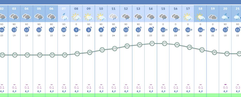 Durante esa franja, la Aemet prevé cielos muy nubosos, lluvia continua e incluso algún episodio de precipitación moderada. Las temperaturas se moverán entre los 18 y 27 grados, con viento del suroeste moderado.