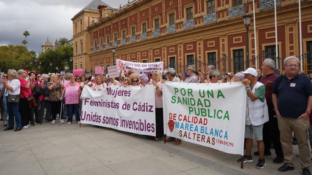 La avenida de Roma se llenó de pancartas, camisetas y lazos rosas en una movilización masiva que unió a colectivos como Amama Sevilla, Mujeres Feministas de Cádiz y Marea Blanca, que portaban mensajes como «sanidad pública de calidad» o «Moreno, dimisión». En algunos carteles se podía leer también: «La sanidad pública cada vez más pobre y los políticos del PP, más ricos».