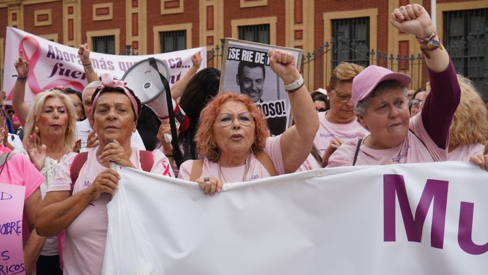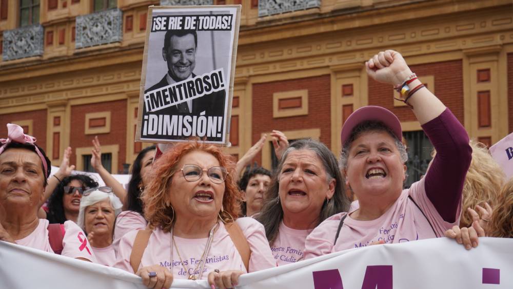 Miles de personas —en su mayoría mujeres procedentes de distintos puntos de Andalucía— se han concentrado esta mañana a las puertas del Palacio de San Telmo para protestar por los fallos en los cribados del cáncer de mama. Convocadas por asociaciones de pacientes y colectivos feministas, las asistentes han alzado la voz contra el presidente andaluz, Juanma Moreno, a quien exigieron su dimisión, y en defensa de la sanidad pública.