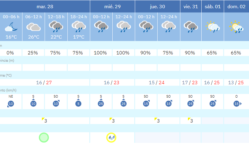 El jueves seguirá la tendencia del miércoles, aunque con una ligera mejoría. Aun así, la probabilidad de lluvia seguirá siendo muy alta: 90% por la mañana y 75% por la tarde. Los cielos permanecerán cubiertos durante la mayor parte del día, y las temperaturas se situarán entre los 15 y 24 grados, sin grandes variaciones. El viento soplará moderado del suroeste, alcanzando rachas de hasta 15 km/h, lo que contribuirá a mantener una sensación térmica fresca y húmeda.