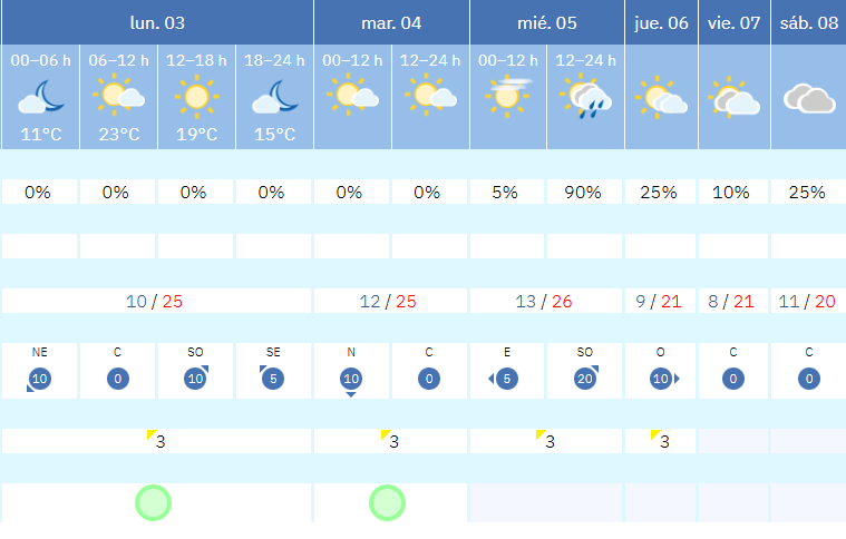 El jueves 6 la probabilidad de precipitaciones descenderá al 25 %, dando paso a una mejora progresiva del tiempo. Las temperaturas bajarán ligeramente, con mínimas de 9 grados y máximas de 21, y el viento soplará de suroeste con algo más de intensidad.