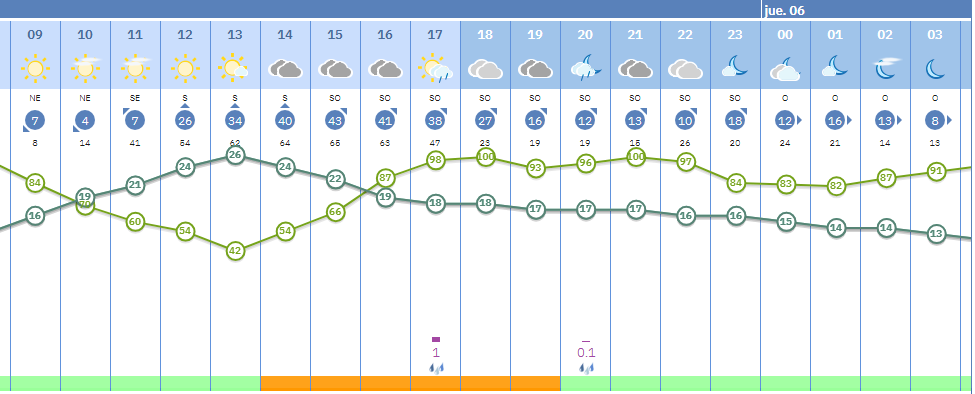 Según la previsión facilitada, la lluvia será especialmente intensa a partir del mediodía, con probabilidad del 100% entre las 12:00 y las 18:00 y persistencia durante la tarde-noche. El aviso naranja estará activo entre las 14:00 y las 19:00, con el pico previsto alrededor de las 17:00.