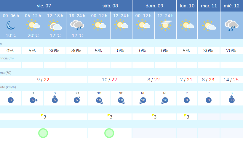 No será hasta el martes 11 cuando aparezcan los primeros indicios de cambio. Ese día la Aemet eleva la probabilidad de precipitaciones hasta el 30%, acompañado de un aumento progresivo de la nubosidad. La lluvia, sin embargo, se espera con más claridad el miércoles 12, cuando el riesgo de precipitaciones se incrementa hasta el 70% en la franja de tarde, señalando la llegada de un frente que podría dejar acumulados moderados.