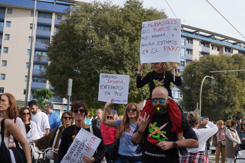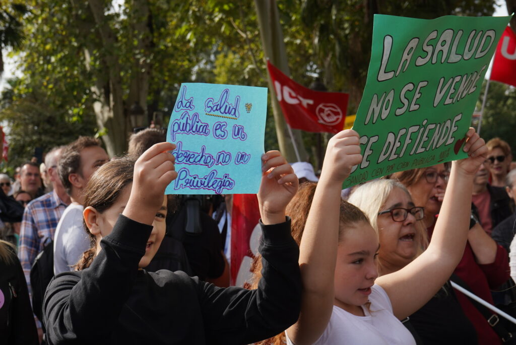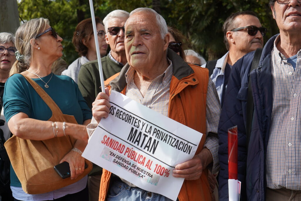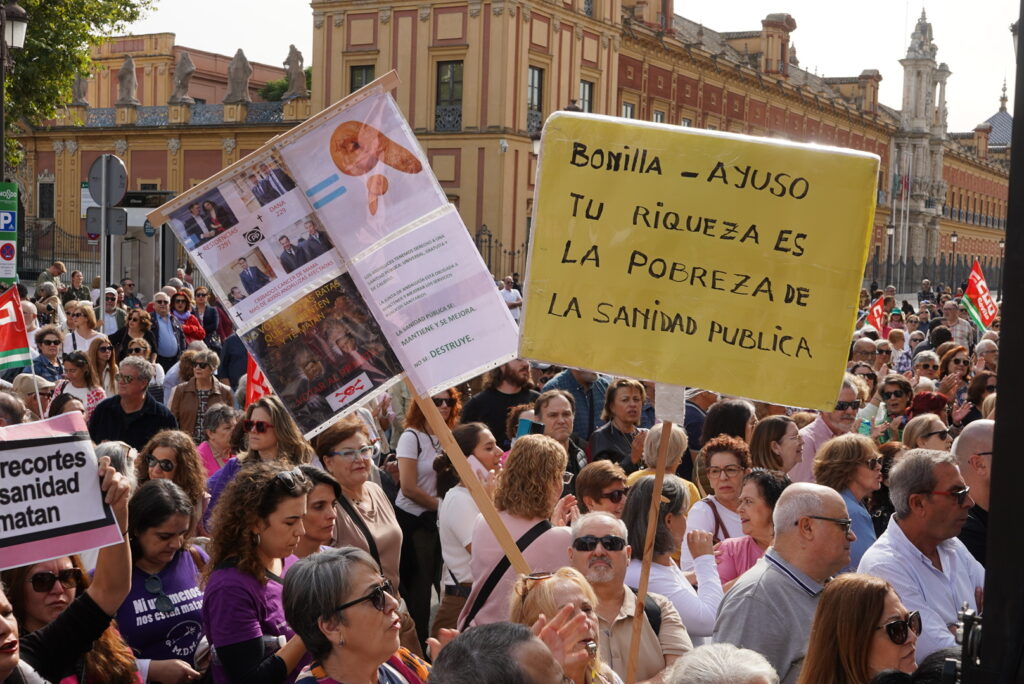 Hubo un instante, a la altura de Viapol, en que la marcha pareció convertirse en un tapiz continuo de pancartas y camisetas: familias con niños, jubilados, sanitarios con batas y sindicatos tras sus banderolas. A las 12:00 horas, la columna arrancó en la estación de San Bernardo y avanzó hacia el Palacio de San Telmo con una consigna clara: defender la sanidad pública andaluza. La convocatoria partía de la Coordinadora Andaluza de Mareas Blancas y contó con el respaldo de UGT, CCOO y decenas de colectivos ciudadanos.