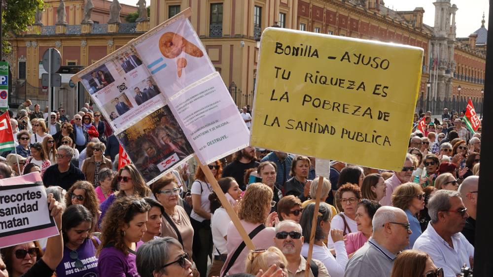 Hubo un instante, a la altura de Viapol, en que la marcha pareció convertirse en un tapiz continuo de pancartas y camisetas: familias con niños, jubilados, sanitarios con batas y sindicatos tras sus banderolas. A las 12:00 horas, la columna arrancó en la estación de San Bernardo y avanzó hacia el Palacio de San Telmo con una consigna clara: defender la sanidad pública andaluza. La convocatoria partía de la Coordinadora Andaluza de Mareas Blancas y contó con el respaldo de UGT, CCOO y decenas de colectivos ciudadanos.