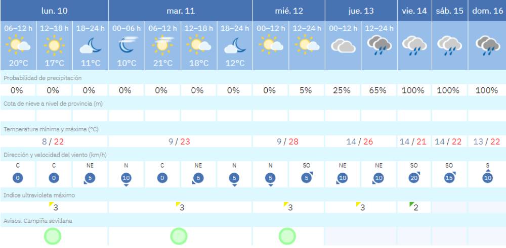 Sevilla encara un tramo final de semana claramente marcado por la lluvia. Según la Agencia Estatal de Meteorología, Aemet, la inestabilidad arrancará el jueves 13, con un 65% de probabilidad de precipitaciones y termómetros entre 14 °C de mínima y 26 °C de máxima. Será una jornada de transición, con chubascos intermitentes y ambiente todavía templado.