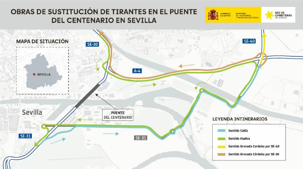 Este martes, día 11 de noviembre, comienzan los cortes de tráfico nocturnos en el Puente del Centenario debido a la sustitución de los tirantes situados entre los kilómetros 10 y 12 de la SE-30, tal y como ha informado el Ministerio de Transportes y Movilidad Sostenible. Actualmente se están realizando los trabajos de ampliación del tablero del puente. Las obras cuentan con un presupuesto vigente de 136,95 millones de euros (IVA incluido).