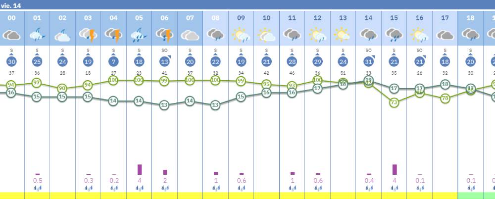 Entre las 14:00 y las 15:00 horas, la Aemet pronostica las segundas lluvias más intensas del día, acompañadas de fuertes rachas de viento que podrían dificultar la circulación y las actividades al aire libre.
