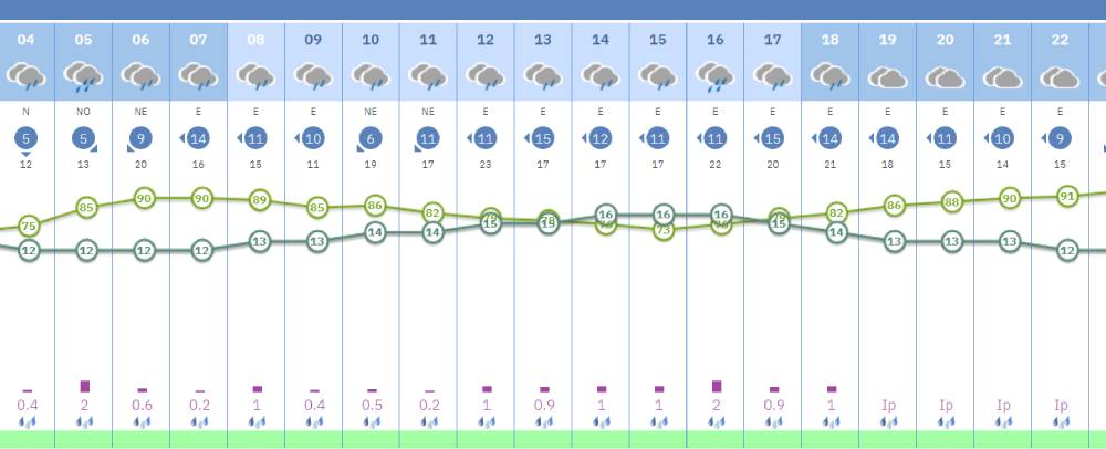 Las temperaturas se mantendrán estables, con mínimas de 12 grados y máximas cercanas a los 16. La sensación térmica será más fresca debido a la alta humedad, que alcanzará picos del 90% entre las 6:00 y las 7:00, coincidiendo con los periodos de mayor precipitación.