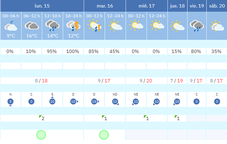 De cara al resto de la semana, la previsión apunta a una mejoría progresiva del tiempo, aunque con algunos altibajos. El martes todavía estará marcado por la inestabilidad, con probabilidad alta de precipitaciones, especialmente durante la mañana, y temperaturas que oscilarán entre los 9 y los 17 grados.