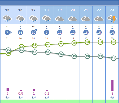 Será, sin embargo, a última hora del día cuando llegue el tramo más adverso. En torno a las 23:00 horas, la previsión apunta a un repunte notable de las precipitaciones, con hasta 8 litros por metro cuadrado en apenas una hora, coincidiendo además con la posibilidad de tormentas. Este será el momento de mayor intensidad del episodio lluvioso del lunes.