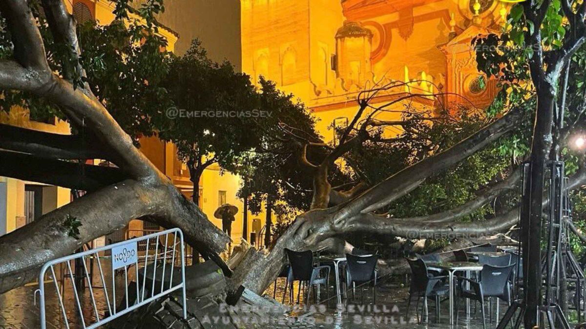 Los servicios operativos del Ayuntamiento de Sevilla han intervenido en la Plazuela de Santa Ana tras la caída de un árbol, un suceso ocurrido durante el episodio de inestabilidad meteorológica que ha afectado a la ciudad en las últimas horas.