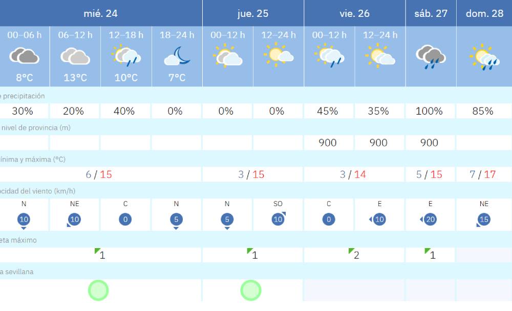 La Agencia Estatal de Meteorología (Aemet) prevé para este martes 24 de diciembre, día de Nochebuena, una probabilidad del 40% de lluvias débiles en Sevilla durante la franja horaria comprendida entre las 12:00 y las 18:00 horas, según los últimos datos publicados por el organismo estatal.