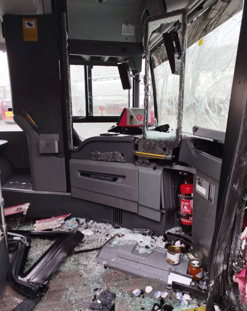 Las fotografías captadas tras el choque contra un local en la avenida Luis Montoto revelan el estado destrozado del autobús: cristales rotos por doquier, piezas del panel de control arrancadas y restos de vidrio esparcidos por el suelo del habitáculo de pasajeros y cabina. El frontal del vehículo aparece seriamente deformado, con la carrocería arrancada y evidentes signos de que el impacto fue de gran violencia.