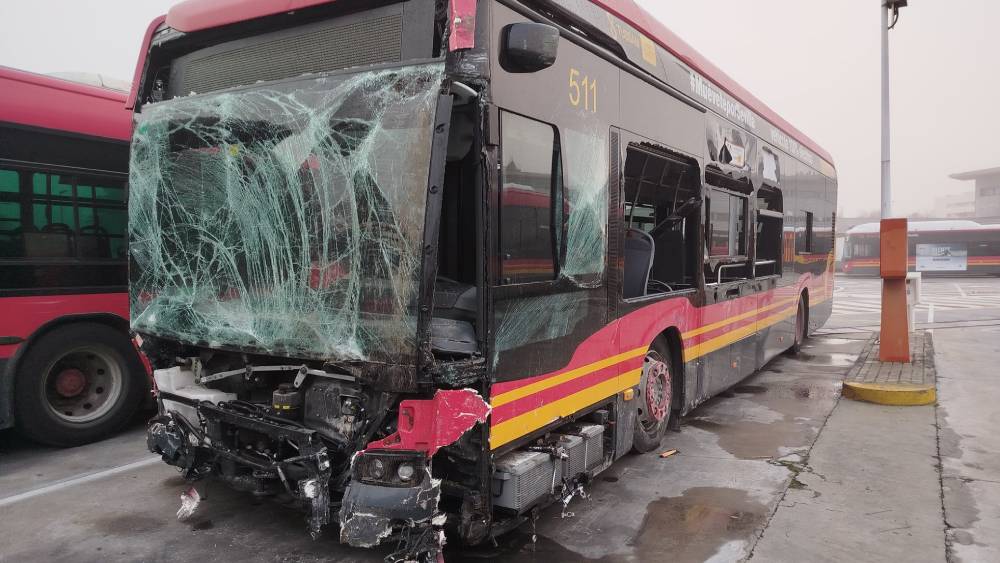 Las fotografías captadas tras el choque contra un local en la avenida Luis Montoto revelan el estado destrozado del autobús: cristales rotos por doquier, piezas del panel de control arrancadas y restos de vidrio esparcidos por el suelo del habitáculo de pasajeros y cabina. El frontal del vehículo aparece seriamente deformado, con la carrocería arrancada y evidentes signos de que el impacto fue de gran violencia.
