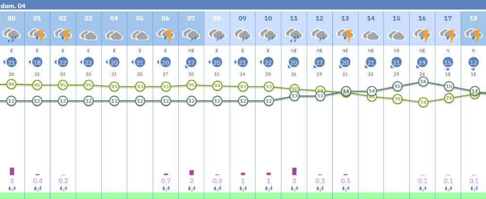 Según la Aemet, el domingo comenzará con lluvia acompañada de tormentas entre las 00:00 y las 2:00 horas, con el cielo completamente cubierto. Tras este primer episodio, las precipitaciones darán una breve tregua hasta primeras horas de la mañana. A las 7:00 horas se espera un nuevo tramo de tormenta, en este caso con lluvia escasa, como antesala del periodo más adverso del día.