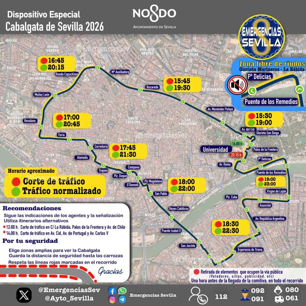 La activación de los desvíos de tráfico comenzará a las 14:00 horas en el entorno de la salida, mientras que una hora antes de la llegada de la comitiva deberán retirarse veladores, sillas y cualquier elemento que ocupe la vía pública en las zonas de tránsito peatonal. La salida oficial de la Cabalgata está prevista a las 16:00 horas desde la Universidad de Sevilla, con entrada estimada de la comitiva a las 22:15 horas.