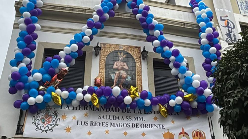 La fachada de la Casa-Hermandad luce ya plenamente vestida para la ocasión. Una gran decoración a base de globos en tonos morados, azules y blancos enmarca el balcón principal del edificio. Bajo esta ornamentación, un cartel preside el balcón con un mensaje claro y directo: «La Hermandad de la Estrella saluda a Sus Majestades los Reyes Magos de Oriente». La imagen se completa con detalles dorados y motivos reales que refuerzan el carácter solemne y a la vez ilusionante de la estampa, convertida ya en uno de los rincones más fotografiados de la jornada.
