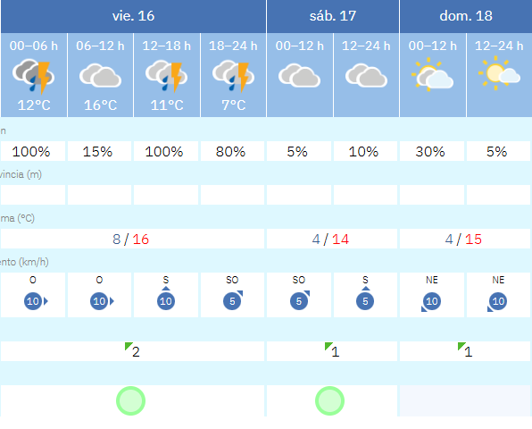 El sábado supondrá un claro punto de inflexión. Aunque los cielos se mantendrán nubosos durante buena parte del día, la probabilidad de precipitaciones será baja, situada en torno al 5 % durante la mañana y 10 % por la tarde, lo que descarta un escenario de lluvias generalizadas.