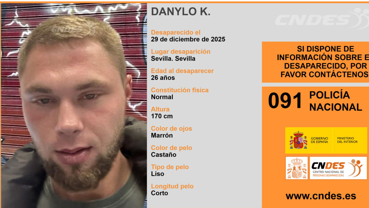 Las autoridades mantienen activa la búsqueda de Danylo K., un joven de 26 años que permanece desaparecido desde el pasado 29 de diciembre de 2025. Según la información difundida a través del Centro Nacional de Desaparecidos (CNDES), su desaparición se produjo en Sevilla capital.