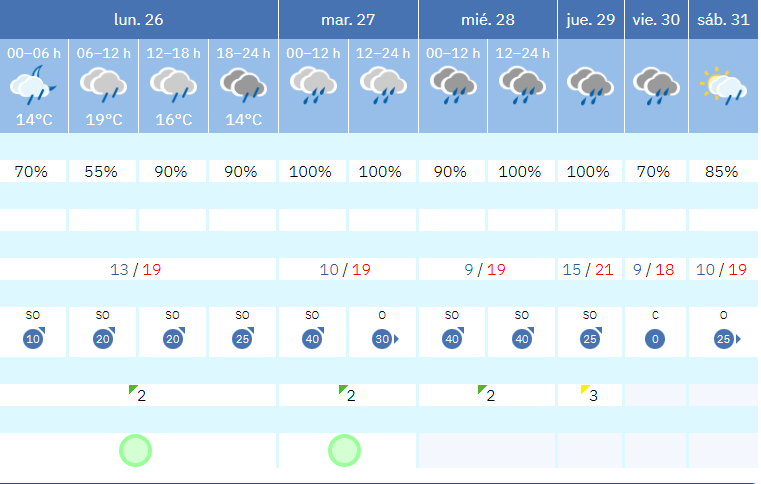Será a partir del martes 27 cuando el mal tiempo se afiance con claridad. La probabilidad de precipitaciones alcanza el 100 % durante todo el día, con lluvias continuas y temperaturas que oscilarán entre los 10 y los 19 grados. El viento del sur y suroeste ganará intensidad, reforzando la sensación de jornada gris y desapacible.