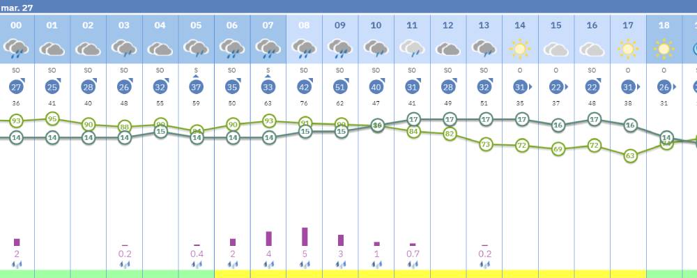 A partir de las 6:00 horas permanecerá activo el aviso amarillo por lluvias y viento, que se extenderá hasta las 17:00 horas. Durante la mañana, la probabilidad de precipitaciones será del 100%, con cielos cubiertos hasta el mediodía. A las 13:00 horas seguirá lloviendo, aunque con menor intensidad.