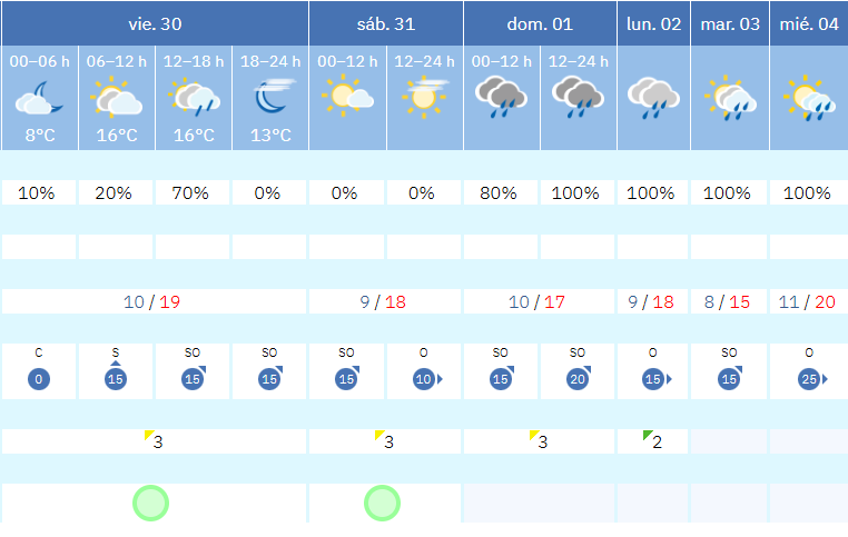 El tiempo dará un giro claro el domingo 1, cuando regresan las lluvias de forma generalizada. Según la Aemet, la probabilidad de precipitaciones alcanza el 80 % en la primera mitad del día y sube hasta el 100 % por la tarde y la noche, lo que apunta a un domingo pasado por agua. Las temperaturas bajan ligeramente, con 10 grados de mínima y 17 de máxima, y el viento de suroeste tenderá a ganar intensidad.